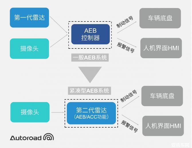 AEB是所有ADAS功能中最重要、最大限度降低死亡率的主動安全功能,不過,AEB的誤觸發(fā)或漏觸發(fā)也給主機廠和消費者帶來了困擾和高風(fēng)險,成為ADAS系統(tǒng)研發(fā)投入中被高度關(guān)注的領(lǐng)域。目前,量產(chǎn)級的AEB系統(tǒng)主流技術(shù)主要通過雷達和攝像頭的數(shù)據(jù)融合實現(xiàn)。攝像頭善于識別目標(biāo),但性能受環(huán)境條件限制非常明顯,在暴雪、暴雨、夜晚弱光環(huán)境或者被強光照射等特殊情況下會增大誤判或者漏判的概率。毫米波雷達與攝像頭的融合改善了攝像頭等光學(xué)傳感器存在的短板。毫米波雷達通過對目標(biāo)物發(fā)送電磁波并接收回波來獲得目標(biāo)物體的距離、速度和角度,不受霧、煙、灰塵、強弱光線等影響,具有全天候全天時的特點。