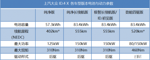 ID4 X采用三元鋰電子動(dòng)力蓄電池,提供57.3kWh和83.4kWh兩種電池容量,并據(jù)此帶來(lái)三種續(xù)航版本,NEDC工況下分別能達(dá)到402km、555km、520km。電池為方形電芯,具有4重電芯安全設(shè)計(jì),通過(guò)了338項(xiàng)遠(yuǎn)超國(guó)標(biāo)的電池包安全測(cè)試,確保汽車安心使用。