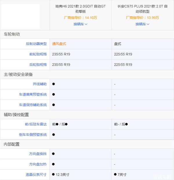 我們以價格相似的第二代哈弗H6 2.0TGDIT GT勁擎版與長安CS75 PLUS 2.0T領(lǐng)航版為例,如圖所示,二者相差非常明顯。