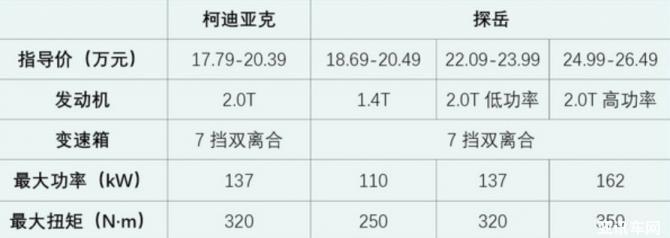 柯迪亞克全系均為2.0T發(fā)動(dòng)機(jī)+7擋雙離合變速箱,最大功率137kW,最大扭矩320N:m;探岳則分1.4T/2.0T低功率/2.0T高功率三款發(fā)動(dòng)機(jī),22.09萬(wàn)以上車款才給到2.0T低功率發(fā)動(dòng)機(jī),全系配7擋雙離合變速箱,最大功率110/137/162kW,最大扭矩250/320/350Nm。