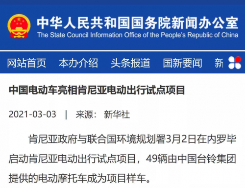 隨后,新華社在第一時間報道了“臺鈴攜手聯(lián)合國環(huán)境署打造肯尼亞電動出行試點事件”,該新聞還得到了國務院新聞辦官網(wǎng)轉(zhuǎn)發(fā),這也是行業(yè)首家電動車企業(yè)獲國務院新聞辦點贊!