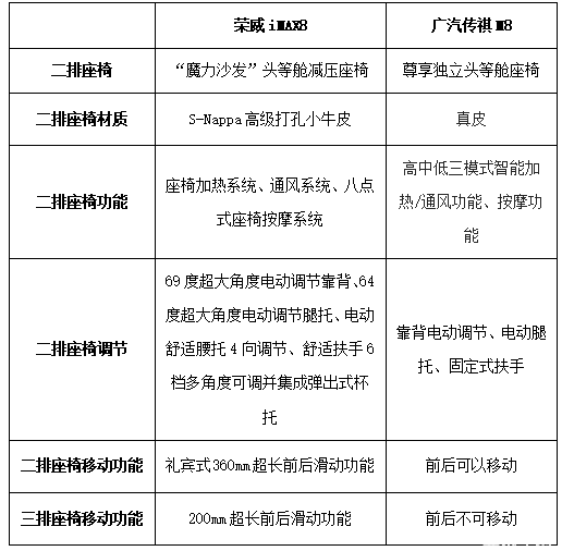 為了給用戶(hù)帶來(lái)尊崇的乘坐體驗(yàn),MPV車(chē)型的第二排區(qū)域一直都是汽車(chē)品牌研發(fā)的重點(diǎn)。榮威iMAX8在第二排配備了“魔力沙發(fā)”頭等艙減壓座椅。該座椅表面包裹S-Nappa高級(jí)打孔小牛皮,內(nèi)部以絲綿、發(fā)泡填充,還采用零重力設(shè)計(jì),讓乘客背部、臂部受力均勻,且通風(fēng)、按摩、電動(dòng)調(diào)節(jié)等功能一應(yīng)俱全,有效緩解旅途勞頓。車(chē)內(nèi)二、三排支持超長(zhǎng)前后滑動(dòng),通過(guò)靈活空間組合帶來(lái)頭等艙般體驗(yàn)。廣汽傳祺M8在二排座椅上的表現(xiàn)也沒(méi)有讓人失望,配備加熱、通風(fēng)、按摩等功能,但二排座椅本來(lái)寬度就不夠,兩側(cè)還封閉起來(lái),導(dǎo)致乘客長(zhǎng)途乘坐時(shí)腿部無(wú)法活動(dòng),乘坐感不佳,且中間過(guò)道又比較窄,二三排上下車(chē)也很麻煩。
