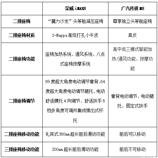 為了給用戶帶來尊崇的乘坐體驗,MPV車型的第二排區(qū)域一直都是汽車品牌研發(fā)的重點。榮威iMAX8在第二排配備了“魔力沙發(fā)”頭等艙減壓座椅。該座椅表面包裹S-Nappa高級打孔小牛皮,內(nèi)部以絲綿、發(fā)泡填充,還采用零重力設(shè)計,讓乘客背部、臂部受力均勻,且通風(fēng)、按摩、電動調(diào)節(jié)等功能一應(yīng)俱全,有效緩解旅途勞頓。車內(nèi)二、三排支持超長前后滑動,通過靈活空間組合帶來頭等艙般體驗。廣汽傳祺M8在二排座椅上的表現(xiàn)也沒有讓人失望,配備加熱、通風(fēng)、按摩等功能,但二排座椅本來寬度就不夠,兩側(cè)還封閉起來,導(dǎo)致乘客長途乘坐時腿部無法活動,乘坐感不佳,且中間過道又比較窄,二三排上下車也很麻煩。