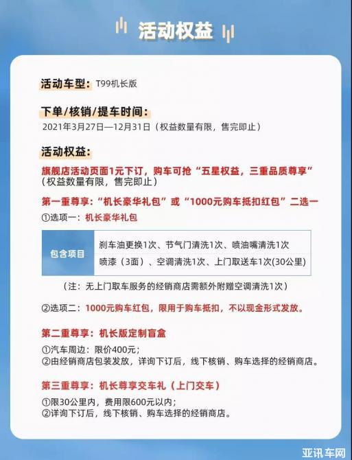 為進一步詮釋機長版專屬權益、打造更加安心的購車體驗,一汽奔騰在T99機長版上提供了個性化和多樣化的選擇,讓消費者得到更大的滿足。在線上開啟的購車專享活動中,為用戶提供“1元下定,享五星權益,三重尊享品質”的專享服務,其中三重尊享權益包括:“機長豪華禮包”或“1000元購車抵扣”、“機長版定制盲盒”以及“機長尊享交車禮”,并在奔騰官方電商平臺以及京東、淘寶、汽車之家和易車旗艦店同步發(fā)售。