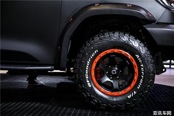 側(cè)面,黑彈進行了升高,上下控制臂和及羊角都進行了加強版的改裝,著重突出硬派越野的寬體造型。同時采用了越野防脫圈輪轂,搭配泥地胎,貨箱部分帶有龍門架,配色和整個車身相呼應(yīng);輪胎方面搭配了龍爪胎,不僅實用,還很好看,橙色的點綴減少了車身的厚重感;內(nèi)部還備有一個全尺寸備胎,使得整車野性元素非常突出。