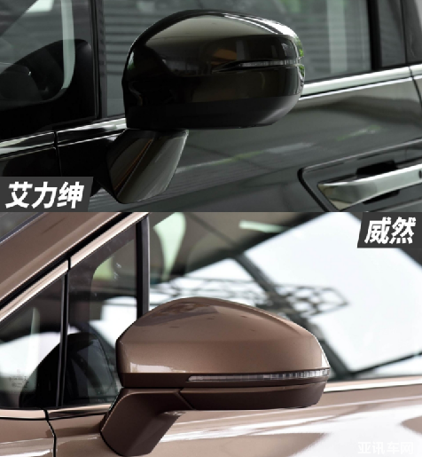 兩車均配備了外后視鏡電動調(diào)節(jié),艾力紳配備了內(nèi)后視鏡手動防眩目,多了外后視鏡電動折疊;威然配備了內(nèi)后視鏡自動防眩目,多了外后視鏡加熱、記憶。
