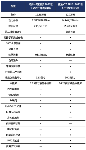 為了更直觀地進行配置對比,我們選取兩款車售價都在12萬左右的車型做分析,分別為哈弗H6國潮版 2021款1.5GDIT自動超豪版和捷途X70 PLUS 2021款1.6T DCT地。