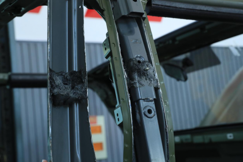 BJ40另一個(gè)特別安全配置則是“雙B柱”,拆解過(guò)程中我們發(fā)現(xiàn)BJ40的雙B柱居然是實(shí)心的,除了封閉管材之外,剛才介紹過(guò)的防滾架也有一部分插入了進(jìn)去,形成了“雙重保護(hù)”。這樣的雙重保護(hù)不僅僅是對(duì)于側(cè)撞的高強(qiáng)度防護(hù),同時(shí)更是車頂抗壓能力的直接支撐!這樣的車頂抗壓力加上剛才所說(shuō)的防滾架,讓BJ40整個(gè)多閉環(huán)的車身結(jié)構(gòu),可以做到“上不松,下不動(dòng)”。