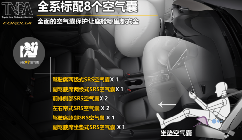 既然TNGA如此厲害,那它究竟賦予了第十二代卡羅拉怎樣的安全性能進(jìn)階呢?我們先從硬件方面,也就是通常統(tǒng)稱為的“被動安全”,來探一探究竟。首先,第十二代卡羅拉采用了豐田GOA高剛性車身以及底盤加強筋、發(fā)動機(jī)艙頂巴式結(jié)構(gòu)設(shè)計,鍛造了一副高安全身骨,在碰撞發(fā)生時有效吸收碰撞能量保護(hù)座艙內(nèi)安全;其次,在全系標(biāo)配8個SRS空氣囊、6大被動安全配置,以及TPMS胎壓監(jiān)測系統(tǒng)(帶定位),有效提升駕乘人員的安全;同時,還在全系標(biāo)配了CN95認(rèn)證空調(diào)濾清器,大幅提升了后疫情時代,廣大消費者更為在乎的車內(nèi)空氣安全和健康。