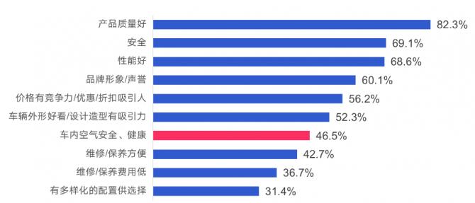 2021年3月初,J.D. Power(君迪)通過社交媒體發(fā)起了“新冠肺炎疫情對消費者購車意愿影響”的小調(diào)查。數(shù)據(jù)統(tǒng)計顯示,中國消費者的前三大購車考慮因素是質(zhì)量(82.3%)、安全(69.1%)和性能(68.6%),但疫情使車內(nèi)空氣安全和健康上升成為購車時的又一考量重點(46.5%)。