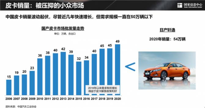 一直以來,中國皮卡銷量波動起伏,盡管近幾年快速增長,但需求規(guī)模一直在50萬輛以下。中國的皮卡滲透率僅為1.8%,遠低于全球平均水平。