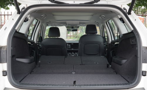 至于第三排座椅空間,筆者找了一個173cm的體驗者坐進去,在保持第二排座椅不動的情況下,第三排腿部空間僅有兩指,頭部空間略有余量。整體來看,就乘坐空間來講,柯迪亞克的表現(xiàn)還是很不錯的,畢竟第二排在已經(jīng)坐了184cm的大個后,第三排還能坐下一個成年人,對于全家短途出行尤為友好。而后備箱方面,整個內(nèi)部空間比較規(guī)整,且將座椅放倒之后,能夠獲得2065升的最大儲物容積,載物能力相當(dāng)不錯。此外,在座椅放倒后,它的尾箱最大進深可達1880mm,寬度為1000-1380mm,且平整度很好,自駕游時放倒即可當(dāng)床使用。