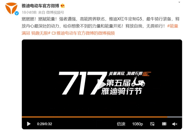7月11日,“雅迪電動車官方微博”官宣了與紅牛安奈吉合作的消息。從視頻中可以看出,此次717騎行節(jié),雅迪在秉承往屆騎行節(jié)精神內(nèi)核的同時,還破圈跨界,與圈粉無數(shù)潮酷青年的紅牛安奈吉聯(lián)名,為大家打造一場“能量滿冠 騎趣無限”的騎行之旅。