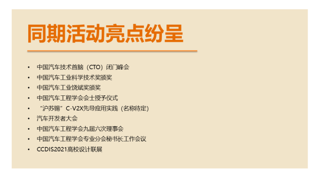 依托大背景、大環(huán)境,2021 SAECCE率行業(yè)之先,立足全新發(fā)展起點(diǎn),邀請(qǐng)汽車及相關(guān)行業(yè)的院士、企業(yè)高層、技術(shù)領(lǐng)軍人物、資深專家學(xué)者、廣大科技工作者,通過主旨發(fā)言、院士論壇、專題討論、國際論壇、論文交流、技術(shù)展覽等多元化形式,討論行業(yè)熱點(diǎn),引領(lǐng)前瞻技術(shù)發(fā)展方向。會(huì)議將圍繞汽車電動(dòng)化、智能化、網(wǎng)聯(lián)化、共享化的發(fā)展趨勢(shì),深度探討跨產(chǎn)業(yè)協(xié)同銜接,統(tǒng)籌推進(jìn)汽車與能源、交通、信息通信等產(chǎn)業(yè)深度融合。
