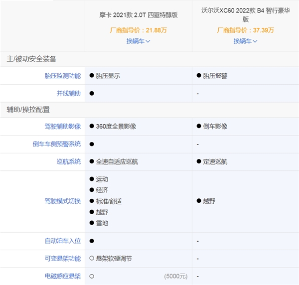 僅針對智能這一點來看,沃爾沃XC60缺少的遠不止AR-HUD、自動泊車系統(tǒng)這兩樣配置。如圖所示,像一些常規(guī)的輔助駕駛功能也未配備,并線輔助、倒車車側(cè)預警、360全景影像等等,每缺失一樣,就為用車減去一份便利。與此同時,最重要的是,這款車型最低配也要37.39萬元,而WEY摩卡頂配卻只需21.88萬元,質(zhì)價比上也有明顯差異。