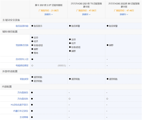 反觀沃爾沃XC60,缺失的遠(yuǎn)不止AR-HUD、自動(dòng)泊車(chē)系統(tǒng)這兩樣智能配置。如圖所示,不論是今天小編試駕的2021款,還是目前最新的2022款,從智能、駕駛、舒適等等維度,均沒(méi)有WEY摩卡的配置周全,但售價(jià)卻是WEY摩卡的二倍不止。