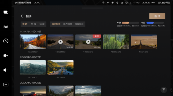 拍攝后的照片和視頻都可以通過點(diǎn)擊行車記錄儀界面的左下角進(jìn)入相冊(cè)界面,根據(jù)車前、車內(nèi)、環(huán)視三個(gè)拍攝視角查看相冊(cè),例如循環(huán)相冊(cè)、用戶相冊(cè)、事件相冊(cè)查看,給用戶更方便快捷的指引。
