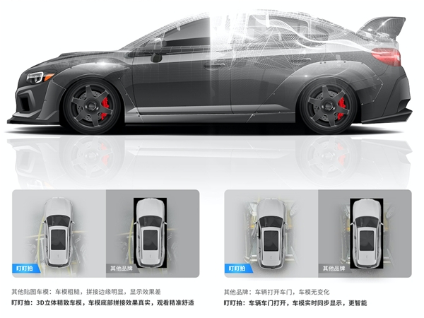 盯盯拍全景車盒V100前后左右四個(gè)攝像頭均為1080P超清分辨率,相比于市場大部分720P分辨率同類產(chǎn)品,畫面清晰度提升2.25倍。支持3D效果顯示車身周邊360度狀況,畫面更加直觀立體,不遺漏車身每個(gè)角落。搭配主流車型精致車模,1:1還原原車外觀,車身外觀及車底陰影處理流暢美觀,并支持原車車門聯(lián)動,車模也可同步車門開合狀態(tài)。