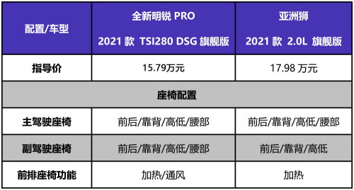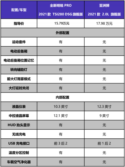 在兩款車的內(nèi)外配置對比中,全新明銳PRO真正做到了一臺頂配車型應(yīng)有的樣子,而售價更高的亞洲獅則顯得吝嗇許多。