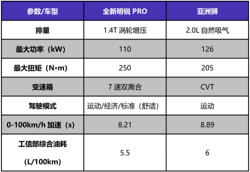 從參數(shù)上可以看出,全新明銳PRO搭載了1.4T渦輪增壓發(fā)動機,最大功率110kW,最大扭矩250N·m,匹配7速雙離合變速箱。而亞洲獅則搭載了2.0L自然吸氣發(fā)動機,最大功率126kW,最大扭矩205N·m,匹配CVT變速箱。全新明銳PRO不僅百公里加速比亞洲獅快,更重要的是油耗也比亞洲獅低,真正做到了高效且省油,極大降低了使用成本。