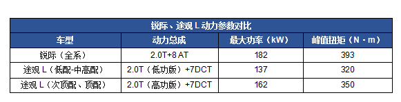 相較而言,途觀L雖然也搭載了2.0T發(fā)動機,卻分成了高、低功率兩個版本。即便是售價高達(dá)25.28萬元的次頂配車型使用了高功率版本,也僅僅是162kW最大功率,峰值扭矩350N·m也比銳際標(biāo)配的2.0T發(fā)動機差了43N·m,在性能上顯得差了些。