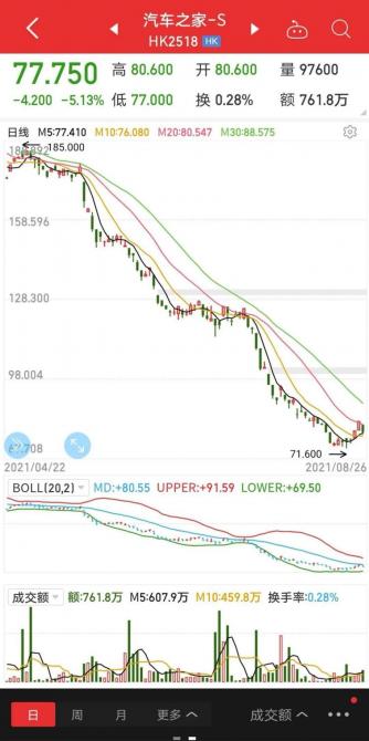 實際上,汽車之家不僅在美股市場表現(xiàn)不好,在港股市場同樣也不如人意。在港股市場,自從今年3月23日錄得199.6港元高點之后,汽車之家整體走勢就不斷向下,截至8月26日,汽車之家股價已經(jīng)跌至77.75港元。