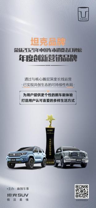 潮動蓉城,樂駕不凡,第24屆成都國際車展正在火熱進行中,在繼上海車展后,坦克品牌再次延續(xù)一貫的頂流氣質(zhì)霸屏車展,以高人氣成為觀眾們的熱門打卡地。本次車展坦克品牌不僅全球發(fā)布坦克400&坦克500兩款重磅新車,更以多維度的營銷舉措強勢出圈,眾多潮玩干貨的“持續(xù)輸出”,帶來了一道道“饕餮盛宴”,全面展現(xiàn)了一個與眾不同的“潮玩坦克”。憑借一直以來在營銷中的亮眼表現(xiàn),坦克品牌斬獲“年度創(chuàng)新營銷品牌”大獎,實力演繹潮玩頂流氣質(zhì)。
