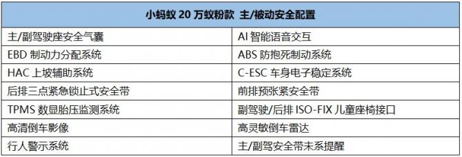 在整個純電小車領(lǐng)域,小螞蟻能夠獨樹一幟,成為“6萬元級微型純電累積銷量冠軍”,和其領(lǐng)先同級的安全性能有著必然的聯(lián)系??梢钥吹?,小螞蟻20萬蟻粉款從車身、三電、配置等方面打造安全座艙,練就“金鐘罩”全方位守護用戶安全出行。