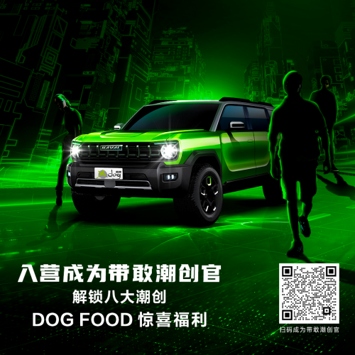 對于鐘情新生代用戶而言,只需即刻掃碼,便可成為帶敢潮創(chuàng)官,發(fā)送潮創(chuàng)宣言,更有機會享受包含屬身份·潮創(chuàng)勛章、有趣社群·靈感碰撞、共創(chuàng)活動·優(yōu)先參與、技術(shù)見證·工廠探秘、國際團隊·大咖交流、冬季標(biāo)定·超前試驗、搶先體驗·優(yōu)先提車共計八大潮創(chuàng)DOG FOOD專屬福利。