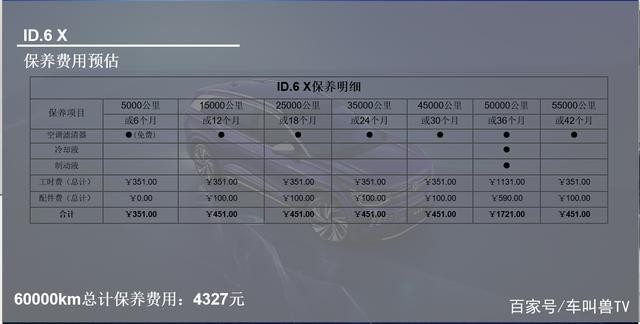說(shuō)完了用電費(fèi)用和保險(xiǎn)費(fèi)用,那接下來(lái)就是保養(yǎng)費(fèi)用了,對(duì)于大部分消費(fèi)者來(lái)說(shuō),質(zhì)保期內(nèi)肯定是在4S店來(lái)保養(yǎng)的,過(guò)了質(zhì)保期有些朋友會(huì)選擇在其他第三方機(jī)構(gòu)來(lái)保養(yǎng),作為一臺(tái)純電動(dòng)車(chē)型,保養(yǎng)相比于燃油車(chē)又有優(yōu)勢(shì)了,根據(jù)ID.6X的保養(yǎng)手冊(cè),車(chē)輛首保為五千公里,首保時(shí)候更換空調(diào)濾芯免費(fèi),檢查三電系統(tǒng)只需要付一下工時(shí)費(fèi)就可,另外以后每一萬(wàn)公里進(jìn)行一次保養(yǎng)。ID.6X常規(guī)保養(yǎng)非常簡(jiǎn)單,需要更換的也只是空調(diào)濾芯了(每一萬(wàn)公里更換),兩年或者5萬(wàn)公里時(shí)更換剎車(chē)油和冷卻液,此外就是工時(shí)費(fèi)了。綜合來(lái)看,三年60000公里總的保養(yǎng)費(fèi)用為4327元,每年的保養(yǎng)花費(fèi)是1442元,還是很省的。