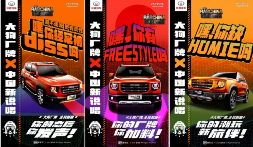 同時(shí),哈弗大狗洞悉年輕人熱捧說(shuō)唱,率先跨界《中國(guó)新說(shuō)唱》節(jié)目,不僅發(fā)布了專(zhuān)屬I(mǎi)CON,還開(kāi)創(chuàng)性地建立了哈弗大狗獨(dú)立廠牌,帶領(lǐng)Rapper選手共創(chuàng)潮玩文化勇敢表達(dá)真我。隨后,哈弗大狗以演繹單曲MV、在線征集說(shuō)唱語(yǔ)錄、開(kāi)啟潮品拍賣(mài)會(huì)等形式,與說(shuō)唱文化背后的龐大青年粉絲群體,一起打破傳統(tǒng)標(biāo)簽,樹(shù)立了“敢言、敢玩、敢躁、更敢野”的潮玩態(tài)度。