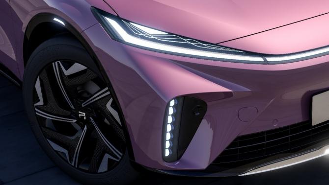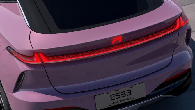 ES33量產版整體造型簡約流暢、動感十足,飽滿體態(tài)下潛藏著蓄勢涌動的生命力。前臉部分,ES33量產版呈俯沖下壓之勢,猶如飽滿有力的“迎風刃”。簡潔通透的厚壁貫穿燈設計,構成 “環(huán)宇流光”大燈,躍動的心動之弦線條和三角聚峰燈型共同妝點出ES33的深邃眼神。作為全球首款配置激光大燈的量產純電車型,ES33配置全新七星激光大燈,遠光光源采用最新一代激光輔助模組,高速時自動開啟,可以提升40%遠光照度。車尾部分,極致翹尾搭載掠翼式貫穿尾燈,從概念車進化的心跳燈,讓跟隨的車輛可以感受到ES33多層次生命感光線塑造。表面獨特的光纖矩陣紋理,以R Logo為中心,逐漸向兩側舒展蔓延,如同美妙的音符,撥動心弦。