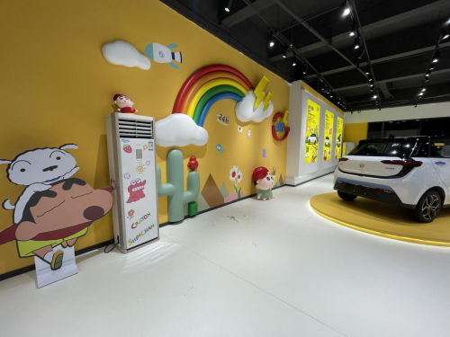 走進電動屋,各種蠟筆小新玩偶呆萌可愛。小新們圍繞著的,正是重慶新特汽車電動屋品牌旗下首款新車“YOUNG光小新”。