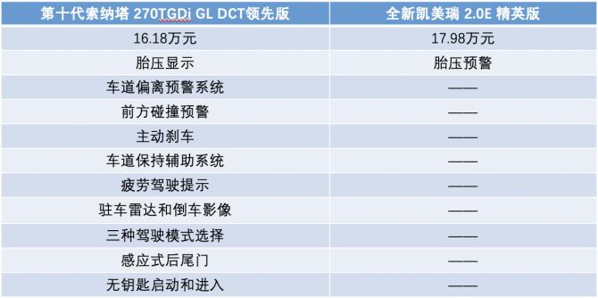 從配置表中不難看出,雖然入門版的凱美瑞相比第十代索納塔指導(dǎo)價(jià)整整貴了1.8萬元,但是在主動(dòng)安全及舒適性配置上第十代索納塔的優(yōu)勢(shì)是碾壓級(jí)的。而諸如倒車影像、無鑰匙啟動(dòng)進(jìn)入、感應(yīng)后備箱等更高級(jí)別的配置在第十代索納塔身上也成為了標(biāo)配,這在講究實(shí)用性的凱美瑞入門版上更是不敢奢望。