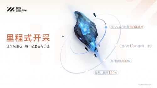 智己汽車(chē)的用戶(hù)可通過(guò)“養(yǎng)成式開(kāi)采”和“里程式開(kāi)采”兩種方式在原石谷獲取數(shù)據(jù)權(quán)益。前者占“原石”總量的30%,后者是基于用戶(hù)日常用車(chē)產(chǎn)生授權(quán)使用的“車(chē)輛與駕駛行為數(shù)據(jù)”獲取“原石”。在該規(guī)則中,“原石”投放的數(shù)量每四年減半,每10分鐘掉落一批,在投放的前四年每批將掉落500枚,每天共計(jì)掉落144次。