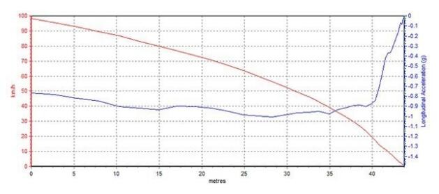 全力制動時,車輛比起加速有明顯的點現(xiàn)象,好在前懸支撐到位,整個姿態(tài)并沒有很狼狽,依舊很穩(wěn)健,并且也沒有出現(xiàn)打滑現(xiàn)象。不過因為下雨天,44.65米的剎車距離并不是很理想,后期等新車上市后我們再進行重新測試一番。