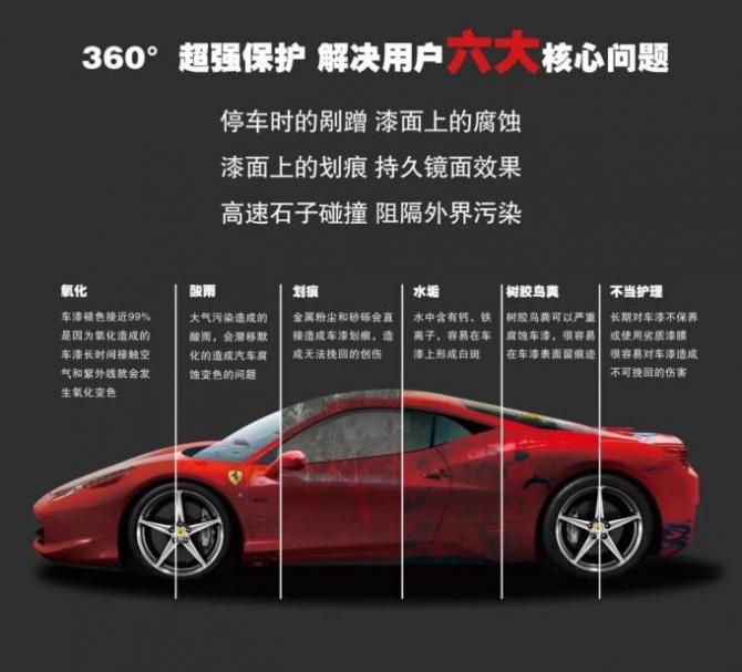 為新車解決6大核心問題,讓您的愛車持久保持嶄新的外觀,360度防止停車時的剮蹭、漆面腐蝕、劃痕、石子碰撞等問題,阻擋外界各種污染。