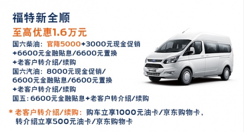 江鈴福特敢對(duì)新全順商旅型的動(dòng)力總成做出終身質(zhì)保服務(wù)承諾,一是對(duì)自身產(chǎn)品的自信,二是希望這項(xiàng)承諾能夠成為車主在用車過程中的堅(jiān)強(qiáng)后盾。此外,即日起至11月30日期間,購買福特新全順國六柴油版,可享受5000元官降優(yōu)惠,還可疊加多重優(yōu)惠,至高可享1.6萬元,助力用戶一路全順,創(chuàng)富創(chuàng)贏,奔向幸福。
