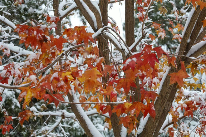 進入香山景區(qū)附近,路況明顯發(fā)生了改變。起初都是平坦筆直的公路,后面就是逐漸崎嶇的盤山公路,蜿蜒曲折;再到后面就是略帶雪水的濕滑山路,坡度較大,開車需要更加小心謹慎。但有一說一,周圍景致確實美輪美奐。大雪紛飛中,我們好像進入了一個童話世界,生命力旺盛的樹枝掛上晶瑩剔透的白雪,一切都是那么的純凈而美好。