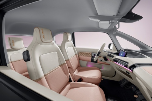 這款車型在外觀上延續(xù)了寶駿KiWi EV極具辨識度的分體式車身設(shè)計,而在內(nèi)飾上面的看點更多,并且目前小編了解到其已經(jīng)公布了高定量產(chǎn)車型的內(nèi)飾細節(jié),并將內(nèi)飾命名為“時髦金”。