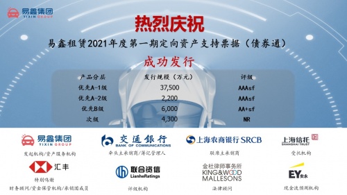另據(jù)了解,匯豐銀行(中國)有限公司擔任了本次交易獨家財務(wù)顧問、資金保管機構(gòu)和承銷團成員,交通銀行股份有限公司為此次交易主承銷商。多方的共同努力保證了交易的順利執(zhí)行,并推動了易鑫租賃證券化項目的國際化進程。