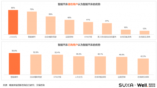從產(chǎn)品層面看,潛在用戶認(rèn)為智能汽車的最大優(yōu)勢在于人車交互;而已購用戶更看重智能硬件。