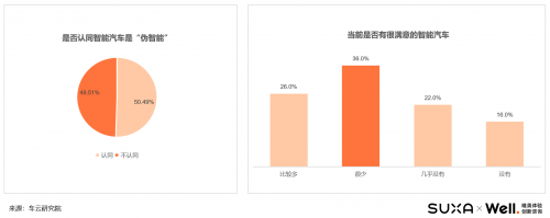 但對于智能化程度,超過一半的消費者認(rèn)為目前市場上大部分智能汽車都是“偽智能”的說法;74%的消費者認(rèn)為目前市場上還沒有讓他們很滿意的智能汽車。