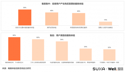 在服務(wù)層面上,售前售中無縫對接的服務(wù)體驗最能促使用戶產(chǎn)生購買意愿;在售后層面用戶最需要及時響應(yīng),其次是工作人員職業(yè)素質(zhì)要高