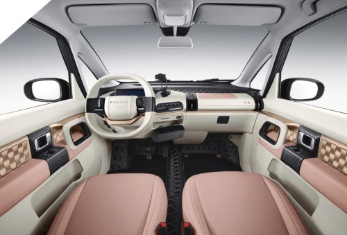 回歸正題,KiWi EV“時(shí)髦金”最大的改變還是內(nèi)飾上的,配色大面積采用“藕粉+米白”,低飽和度的配色方案讓人感覺(jué)更優(yōu)雅精致,不少女生看到這個(gè)配色已經(jīng)大呼心動(dòng),此外材質(zhì)上大面積使用了軟性材質(zhì)包覆,人體經(jīng)常接觸的方向盤(pán)、門(mén)板、座椅等位置都是選取的環(huán)保皮革。此外,考慮到乘坐的舒適感,還在在靠背、坐墊等處則采用局部打孔處理。