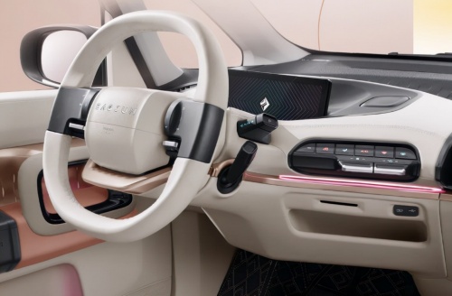 這款寶駿KiWi EV “時髦金”高定版在內(nèi)飾上采用了“藕粉+米白+勞力士金”的流行配色方案,材質上大面積采用軟性材料,在方向盤、門板、座椅等位置都是選取的環(huán)保皮革,靠背、坐墊等處還采用了局部打孔處理。在副駕前方,提供了的自定義刺繡銘牌,在車內(nèi)新增了流光溢彩64色氛圍燈。