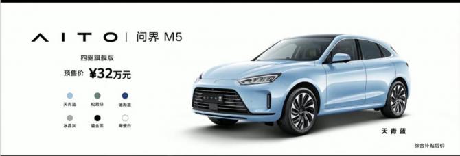 12月23日,AITO品牌旗下首款中型SUV問界M5在華為冬季旗艦新品發(fā)布會(huì)上正式首發(fā),該車推出3款配置車型,補(bǔ)貼后預(yù)售價(jià)為25-32萬元,發(fā)布后就開始預(yù)訂,明年2月上市,春節(jié)后開始交車;同時(shí)前10000位車主還能享受好禮,具體信息見下圖。該車將搭載賽力斯增程式混合動(dòng)力系統(tǒng)以及華為出行領(lǐng)域的前沿技術(shù)。