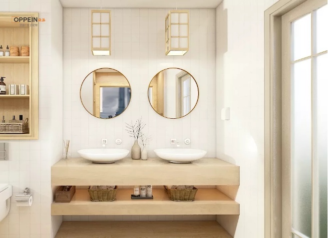 ▲臺上盆時尚感十足,圓鏡更顯柔和溫馨。雙洗手盆的設(shè)計,可同時滿足兩人同時使用,早晨洗漱不用搶,使用更從容。