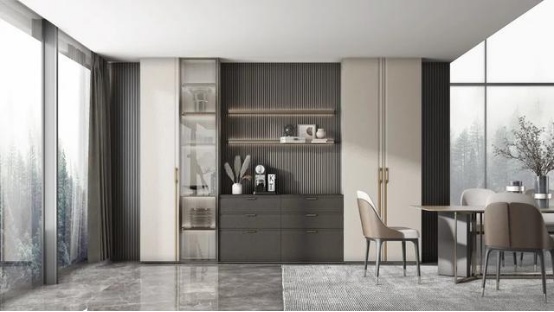 餐邊柜的設計同樣采取了到頂高柜與玻璃柜組合的形式,但是歐派在設計中結合餐邊柜的功能分區(qū),增加了收納抽屜,三層的抽屜低柜給更多餐具提供了容身之所,除此之外,開放空間的一字型置物板用來收納酒水、酒杯,也可以更好地彰顯屋主品味。