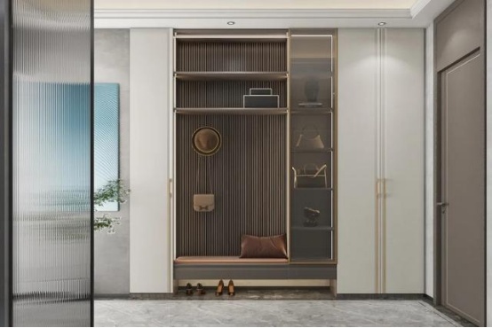 其玄關柜巧妙組合封閉式到頂高柜與透明玻璃柜,封閉空間與開放式空間互相呼應,不僅保留了充足的收納空間,也增強了整體的設計感。開放空間不僅可以用來放置包包,也可以用來當作換鞋凳,加強出門的儀式感。